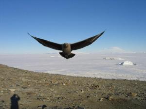 Now, you all know that I have seen the Weddell Seals at Hut Point, and I haven’t posted any pictures or postings of penguins (HAH! Say that five times fast), but the other wild creature of Antarctica has arrived. Yes, the dreaded Stercorarius antarcticus or Brown Skua (a.k.a. dirty seagull, Antarctic Skua, Southern Great Skua, or Hākoakoa (Maori)) has arrived. This is the heaviest species of skua and rivals the largest gulls as the heaviest species in the shorebird order although not in length or wingspan. It is 52–64 cm (20–25 in) in length, 126–160 cm (50–63 in) in wingspan and has a body mass of 1.2–2.13 kg (2.6–4.7 lb). They have longish bills with a hooked tip, and webbed feet with sharp claws. They look like large dark gulls, but have a fleshy cere above the upper mandible. The skuas are strong, acrobatic fliers. They are generally aggressive in disposition. Potential predators who go near their nest will be quickly dived at by the parent bird, which usually targets the head of the intruder. – *Wikipedia